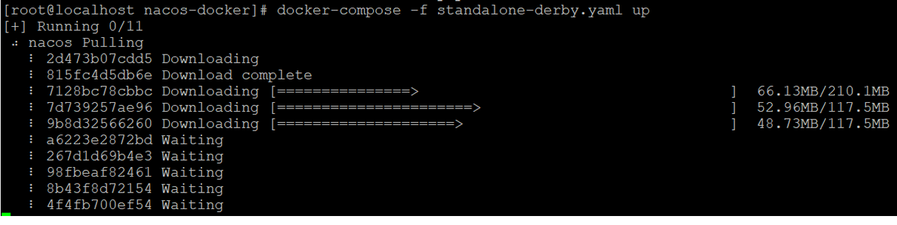 docker-compose -f standalone-derby.yaml up首次启动会拉取 nacos 相关镜像,如下图所示