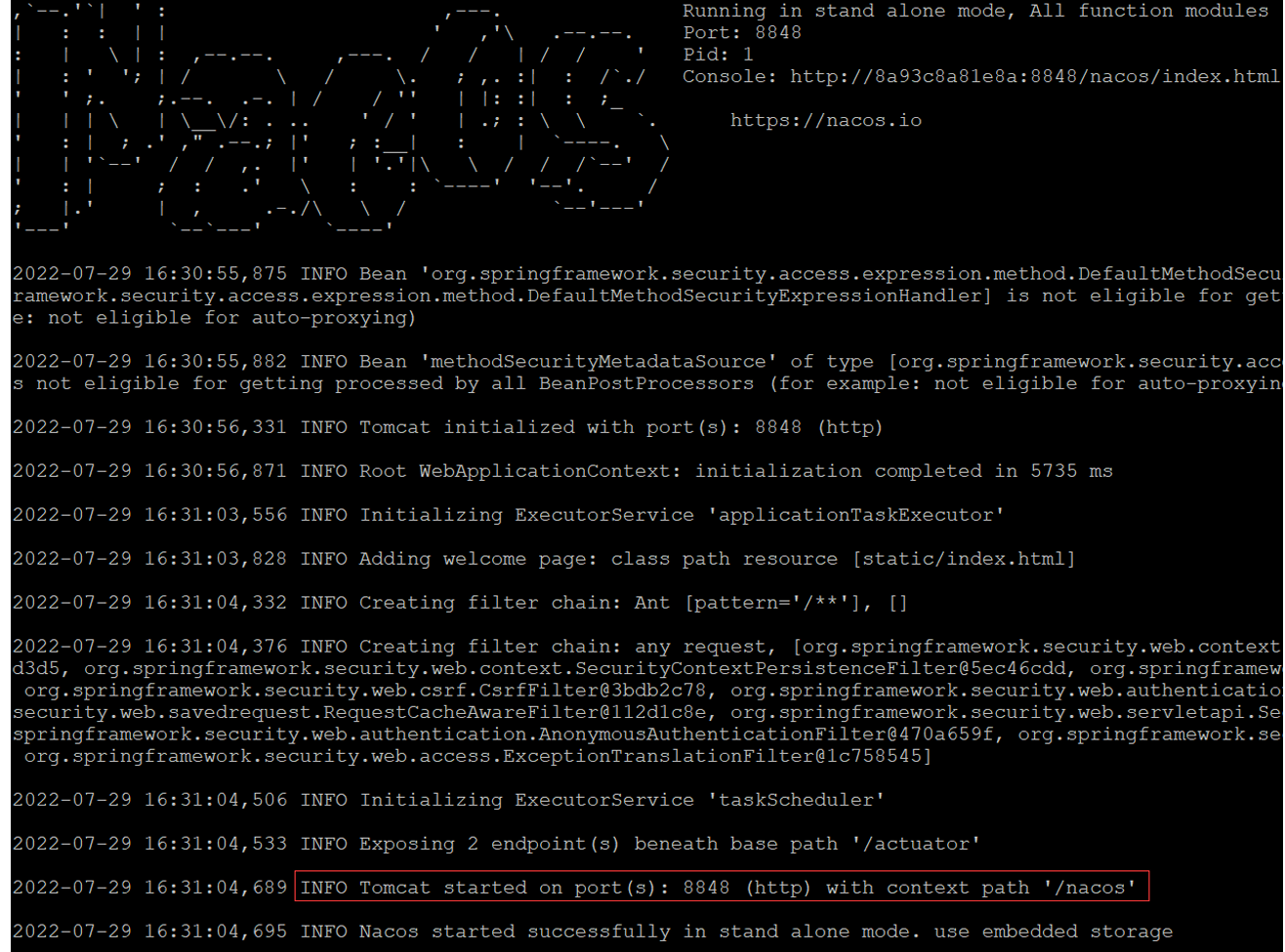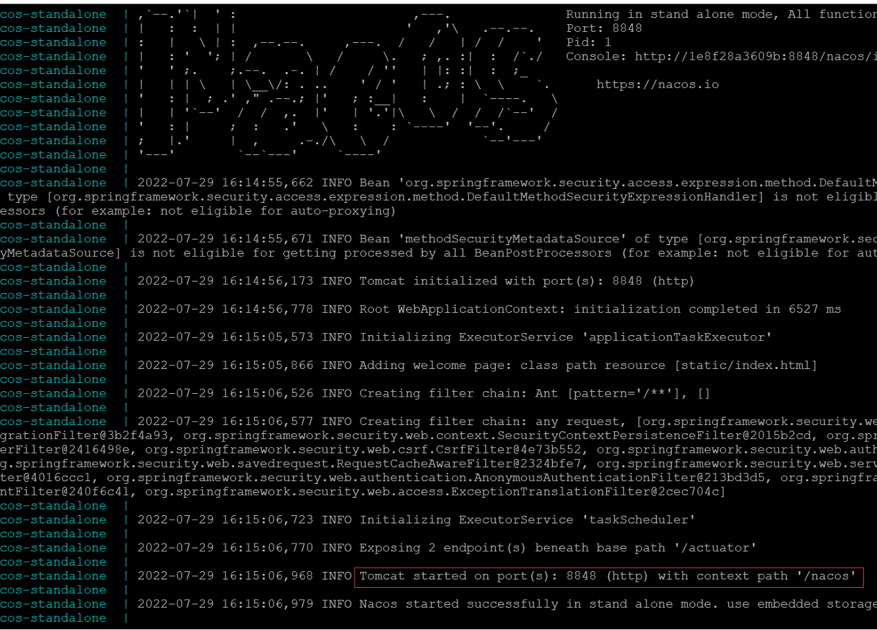 docker logs nacos-standalone看到下面的结果表示后台启动成功