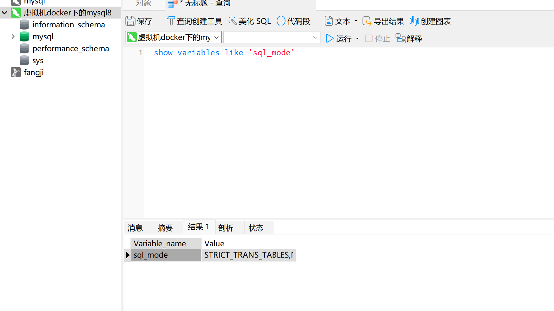 docker restart mysql8show variables like 'sql_mode' 命令来查看对 应变量值是否正确,示例如如下图所示