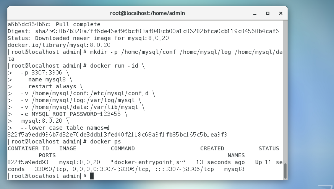 mkdir -p /home/mysql/conf /home/mysql/log /home/mysql/data使用以下命令创建 MySQL 8.0.20 的 Docker 容器: