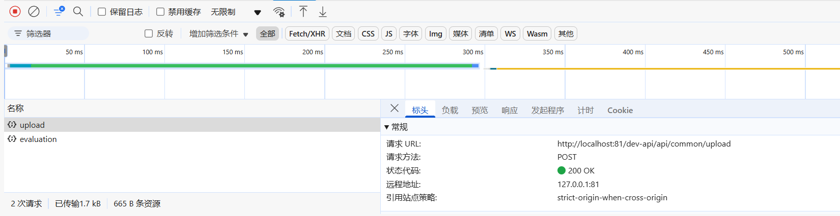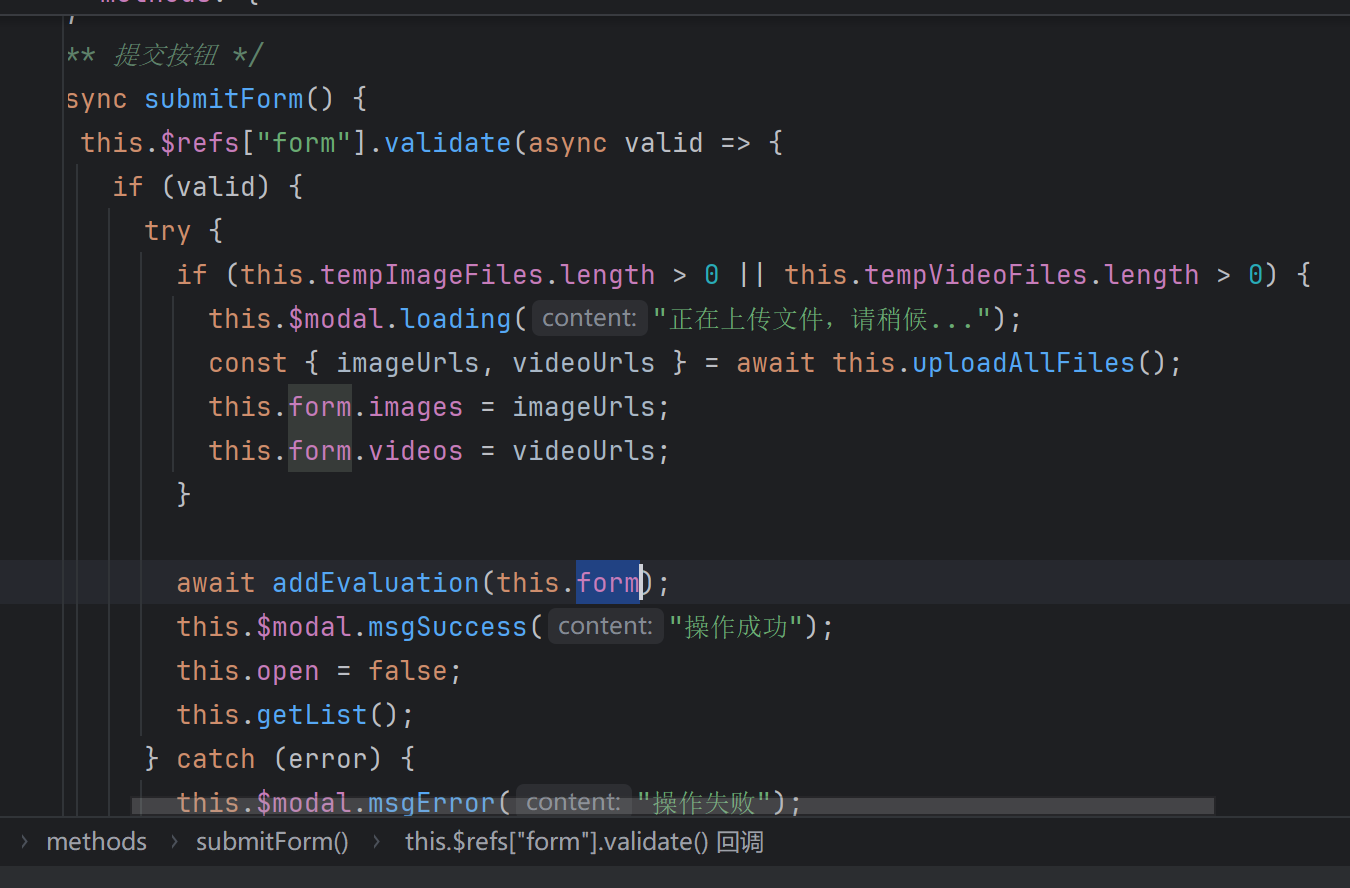 然后我很懵逼不知道什么情况,我一看网络和前端代码,好家伙,他是先进行了一个文件上传,然后回调拿到文件url之后,再去发一个请求