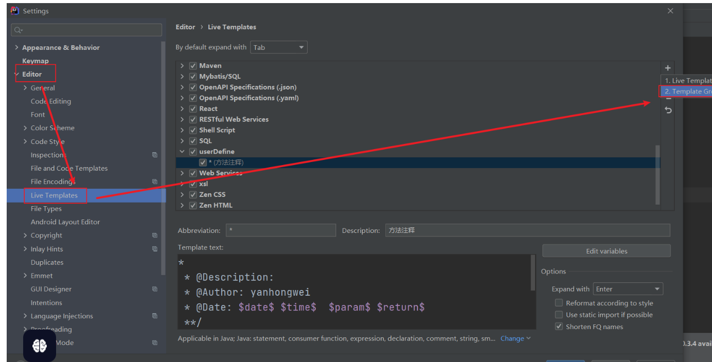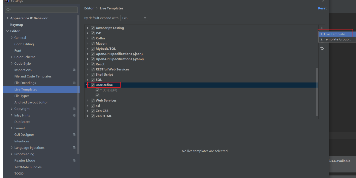 1、File-->Settings-->Editor-->Live Templates