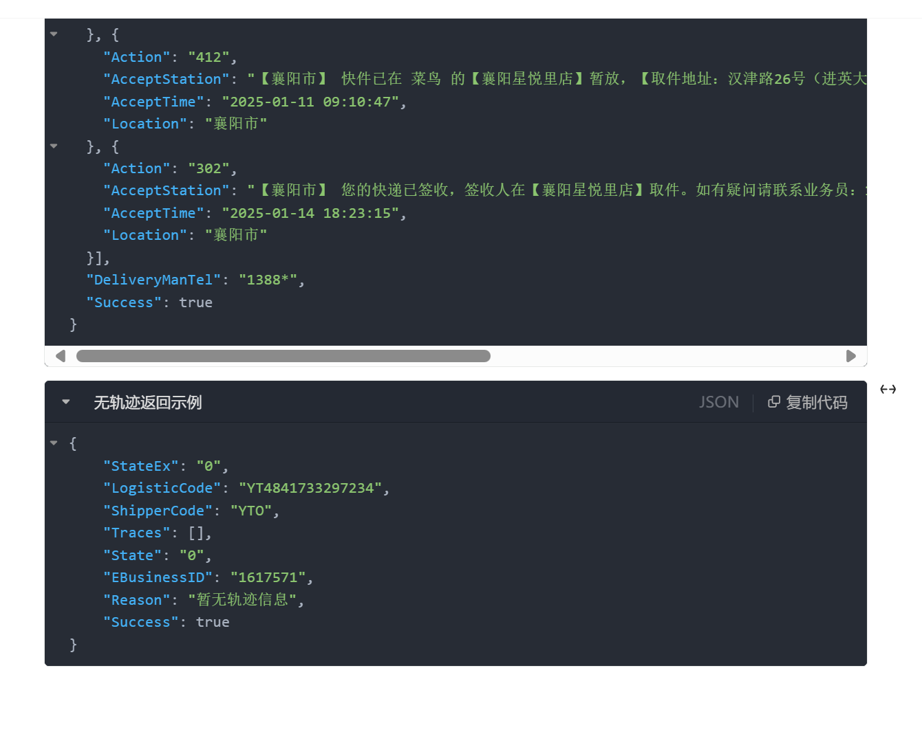 public static KdniaoApiVO getLogisticInfo(KdniaoApiDTO queryDTO) // 对外暴露的查询接口