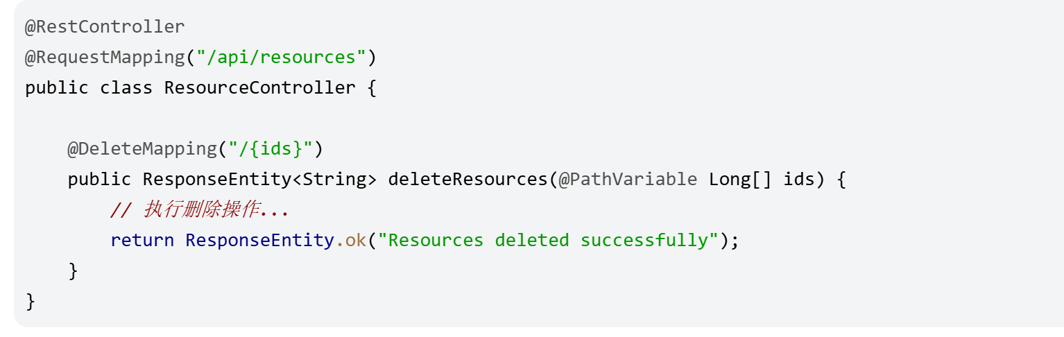 例如,在一个资源管理API中,如果你有一个方法负责批量删除资源,你可以这样做: